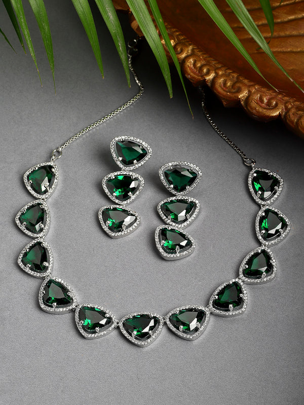This beautifully handcrafted ZENEME set features exquisite American diamond stones expertly arranged to create a radiant, sparkling effect. The rhodium-plated